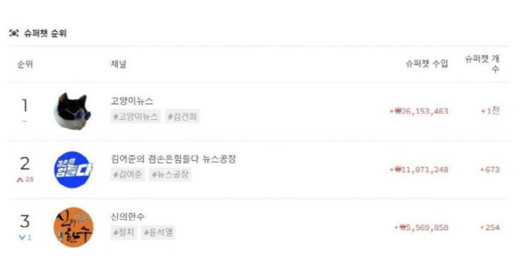 지난 16일, 유튜브 정보 집계 사이트 ‘플레이보드’에 따르면, 윤 대통령 체포가 집행된 날 가장 많은 슈퍼챗 수익을 올린 채널은 진보 성향의 고양이뉴스였습니다. 채널은 단 하루 만에 무려 약 2600만 원의 수익을 기록하며 한국뿐만 아니라 전 세계 유튜브 슈퍼챗 수익 순위 1위를 차지했습니다.