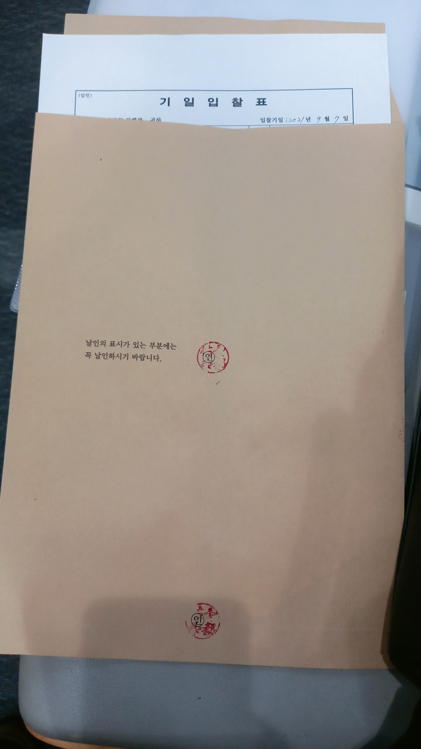 입찰은 10시 30분에 시작해서 11시 50분까지 진행되고 입찰이 끝나자마자 개찰이 시작됩니다. 개찰이 시작되면 바로 낙찰자를 알려줍니다. 최고신고가를 얼마를 썼고 누가 낙찰이 되었는지만 알려주고 2등, 3등의 입찰가는 불러주지 않아서 알 수 없었습니다. 입찰이 시작되면 입찰봉투와 기일입찰표를 배부를 하는데요. 대리인일 경우 위임장을 작성을 해야 하는데요. 위임장은 따로 써서 준비해오셔도 되지만 기일입찰표 뒷면에 보면 위임장이 있기 때문에 현장에서 작성하셔도 됩니다. 입찰봉투에 날인하는 부분이 있는데 입찰 본인이 참여하면 본인의 도장, 대리인일 경우 대리인의 도장을 날인하시면 됩니다. 날인하는 부분이 꽤 여러 군데여서 도장을 많이 찍으셔야 됩니다.