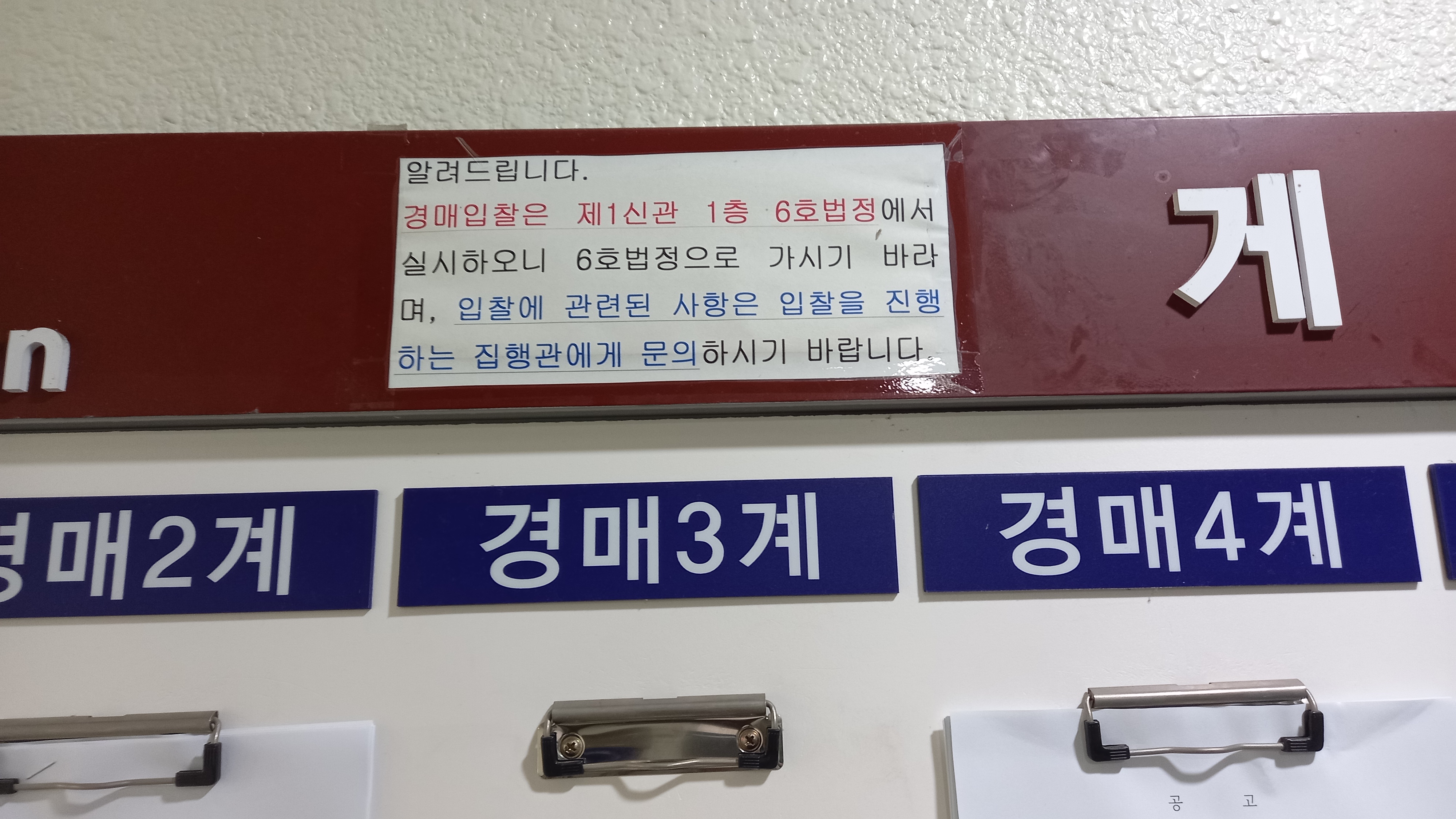 의정부 지방법원 4층 경매과로 가보니 신관 1층 6호 법정으로 가라고 게시되어 있더군요. 오늘 내가 입찰한 물건이 변동사항이 있는지 확인해보고 신관 1층으로 갑니다. 비가 오는 날이었는대도 싸게 경매로 낙찰받고 싶어 하는 분들이 많이 방문했습니다.